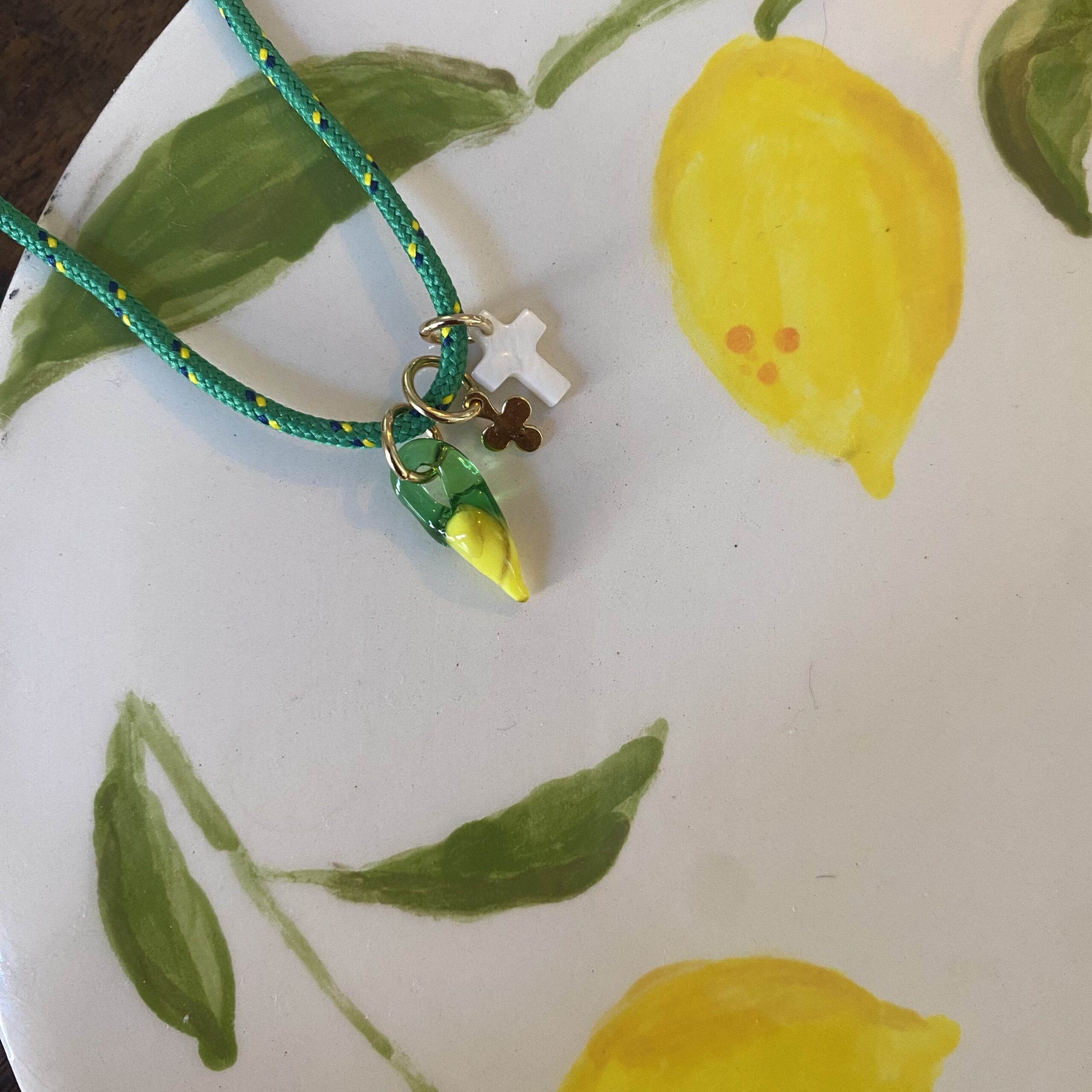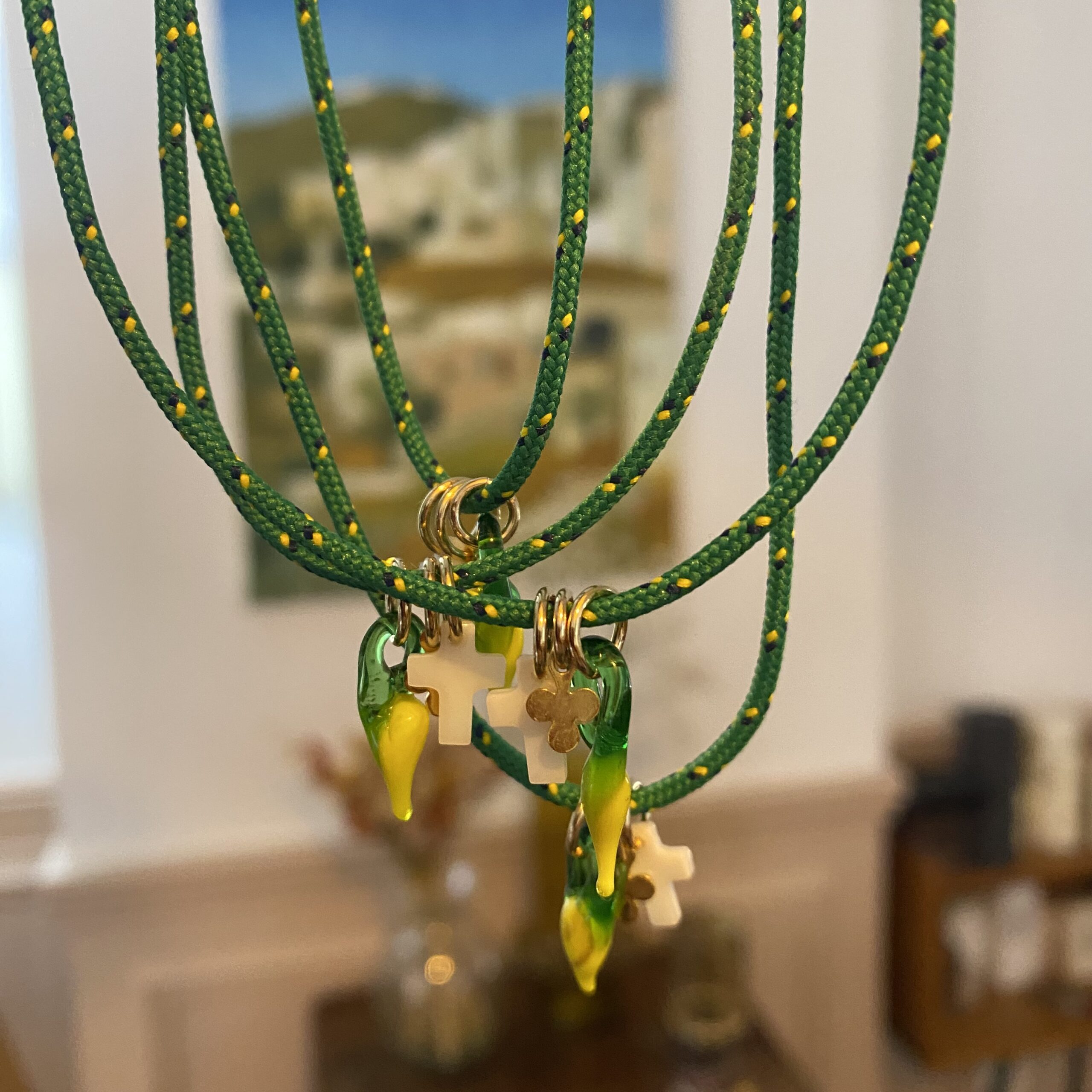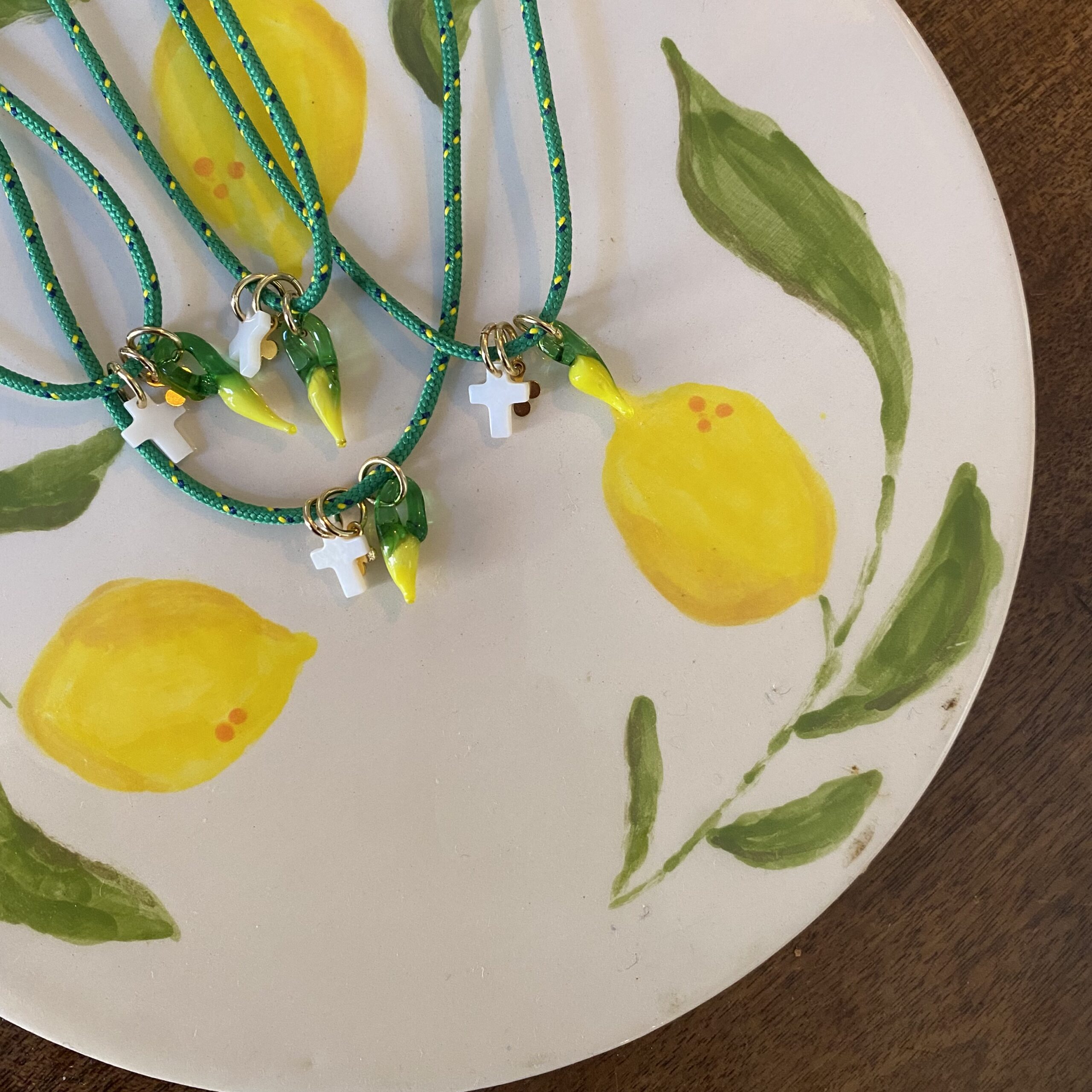 Composé de perles de verre et de détails en plaqué or 3 microns, ce collier met en valeur une croix en nacre naturelle aux reflets irisés. La nacre capte la lumière avec subtilité et apporte une touche à la fois douce, raffinée et intemporelle.